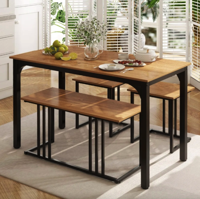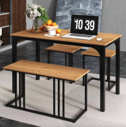 Чіткі геометричні форми, поєднання чорного металу та теплих деревних текстур — все це створює сучасний вигляд у дусі Loft. Такий обідній комплект меблів стане стильним акцентом у вашій кухні, студії або іншому просторі. Складається з одного прямокутного столу, просторої лавки та двох табуретів, що формують зручну зону для загальних трапез. Така конфігурація дає змогу одночасно розмістити до 4 осіб, зберігаючи водночас свободу рухів та естетичну рівновагу. Це ідеальне рішення як для компактної кухні, так і для кафе чи офісної обідньої зони. Кожен елемент комплекту доповнює інші — стильно, практично та з турботою про комфорт.