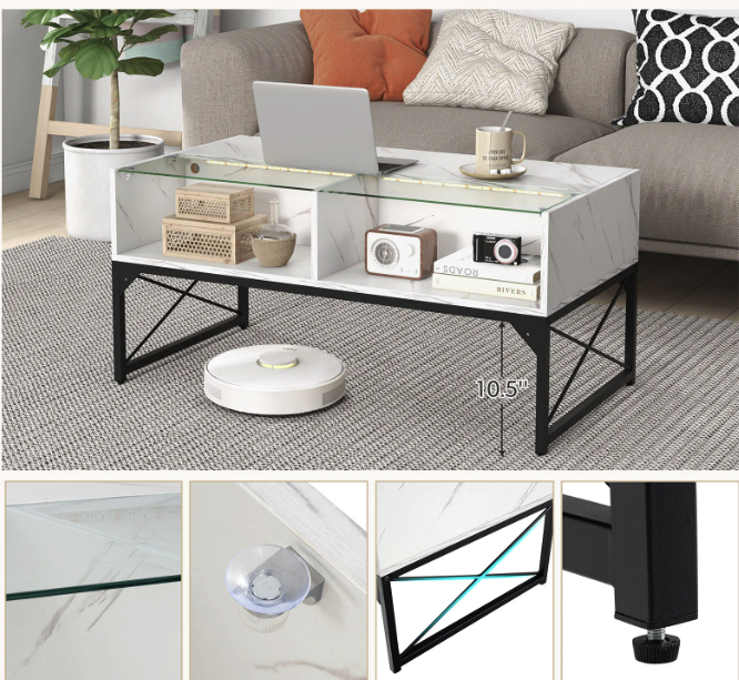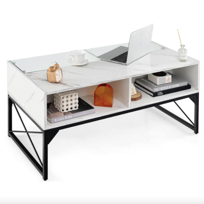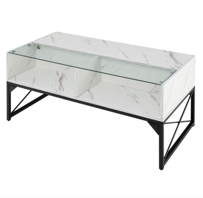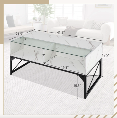 Верхня частина столу розділена на дві зони: одна виготовлена зі штучного мармуру, інша — із загартованого скла. Загартоване скло витримує навантаження до 30 кг. Його важко подряпати, легко очистити, а завдяки захисним присоскам поверхня фіксується міцно та надійно. Вишуканість, що не потребує компромісів із безпекою. Поєднання текстур створює унікальний контраст: глянець, глибина та світловідбиття формують обсяг навіть у мінімалістичному інтер'єрі. Чотири внутрішні куби для зберігання — ідеальні для книг, журналів, пультів, декору. Простора стільниця 105×55 см дає змогу зручно сервірувати напої або розташувати ноутбук. Зовні — елегантність, всередині — лад. Завдяки водонепроникному покриттю, ви можете використовувати стіл навіть для сервірування напоїв без страху забруднити поверхню.