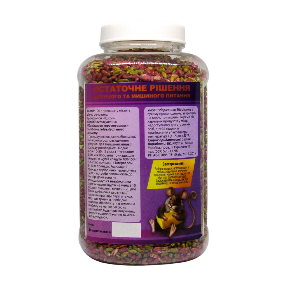 "Ракуминцид Микс" отрава для мышей и крыс, банка 800 г (арахис с сыром) (Круг) купить в Винница по цене 75 грн. Номер предложения 888716 на сайте DOMARKET. Отрута для щурів РАКУМІНЦИД МІКС (арахіс з сиром) є остаточним вирішенням мишачого та щурячого питання! Склад До складу отруєної приманки входять:...