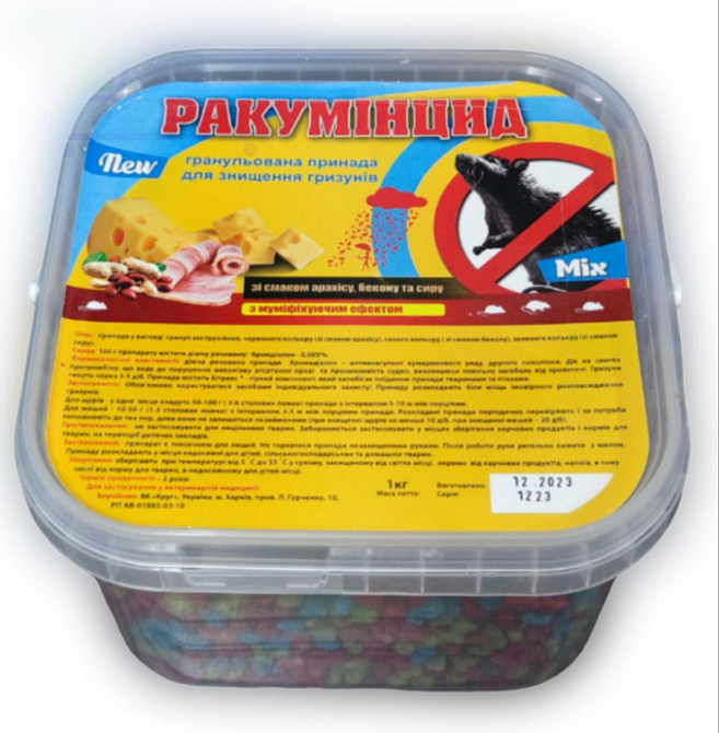 "Ракуминцид NEW" отрава для мышей и крыс Микс со вкусом арахиса,бекона и сыра ведро 1 кг (Круг) купить в Винница по цене 163 грн. Номер предложения 888721 на сайте DOMARKET. СОСТАВ 1 кг препарата содержит: действующее вещество (бромадиолон) – 0,005% ФАРМАКОЛОГИЧЕСКИЕ СВОЙСТВА Действующее вещество приманки ракуминцида –...