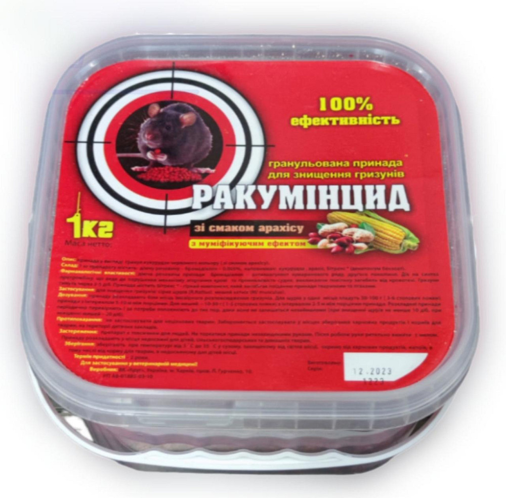 "Ракуминцид NEW" отрава для мышей и крыс со вкусом арахіса ведро 1 кг (Круг) купить в Винница по цене 156 грн. Номер предложения 888720 на сайте DOMARKET. СОСТАВ 1 кг препарата содержит: действующее вещество (бромадиолон) – 0,005%, наполнитель: кукуруза, арахис, битрекс (денатониум бензоат)....