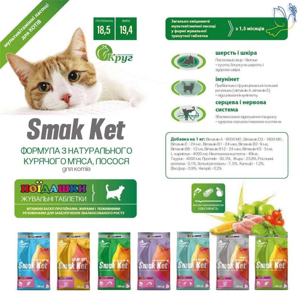 Smak Ket со вкусом лосося и биотином (красного цвета) это одновременно витамины и вкусное лакомство для Вашего питомца. Сделанные в виде привлекательных таблеток, они содержат весь список необходимых витаминов и аминокислот для хорошего самочувствия и настроения. Различаются высоким поеданием и могут использоваться для игр и поощрения.