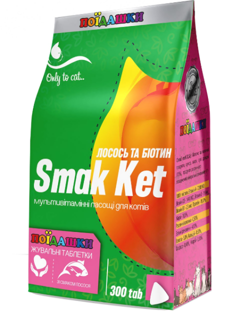 Мультивитаминная пищевая добавка для кошек Smak Ket ЛОСЬ И БИОТИН - это одновременно витамины и вкусное лакомство для Вашего питомца. Сделаны в виде привлекательных таблеток, содержащих весь список витаминов и аминокислот, необходимых для хорошего самочувствия и настроения животного. Различаются высоким поеданием и могут использоваться для игр и поощрения. Витамины представляют собой биологически активные вещества, выполняющие важные функции в организме животных. Составляющие многие ферменты образуют различные комплексные соединения с белками, углеводами, жирами, гормонами, играя важную роль в обмене веществ. Некоторые из них синтезируются в организме, а некоторые попадают в пищу. К сожалению, не всегда рацион вашего любимца может быть сбалансирован по всем показателям, поэтому витамины вводят в рацион дополнительно.