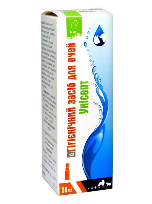 Гигиеническое средство для глаз «Унисепт» представляет собой прозрачную жидкость светлого цвета со слабо выраженным запахом и предназначено для нежного и бережного ухода за глазами животных, предотвращая их сухость и раздражение. Растительные компоненты входящие в состав средства «Унисепт» помогают очистить поверхность глаз, успокаивают боль, снимают отечность и покраснения вокруг глаз, удаляют остатки сухой слизи, уменьшают слезоточивость и раздражение слизистой оболочки глаз, помогают устранить темные пятна под глазами.