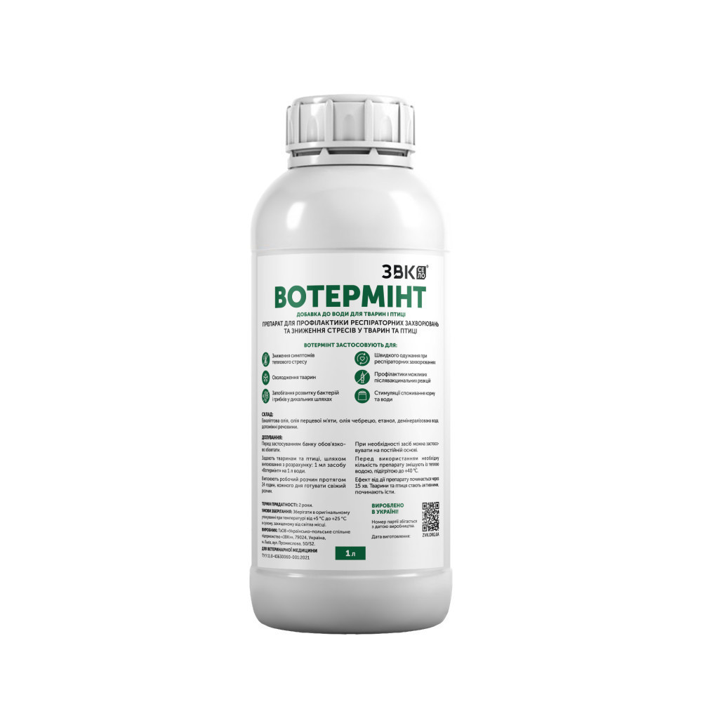 "Вотерминт" для профилактики респираторных заболеваний и стресса - 1 л ЗВК купить в Винница по цене 1 750 грн. Номер предложения 901610 на сайте DOMARKET. Препарат для профилактики респираторных заболеваний и снижения стрессов у животных и птицы. Состав Эвкалиптовое масло, масло перечной мяты, масло...